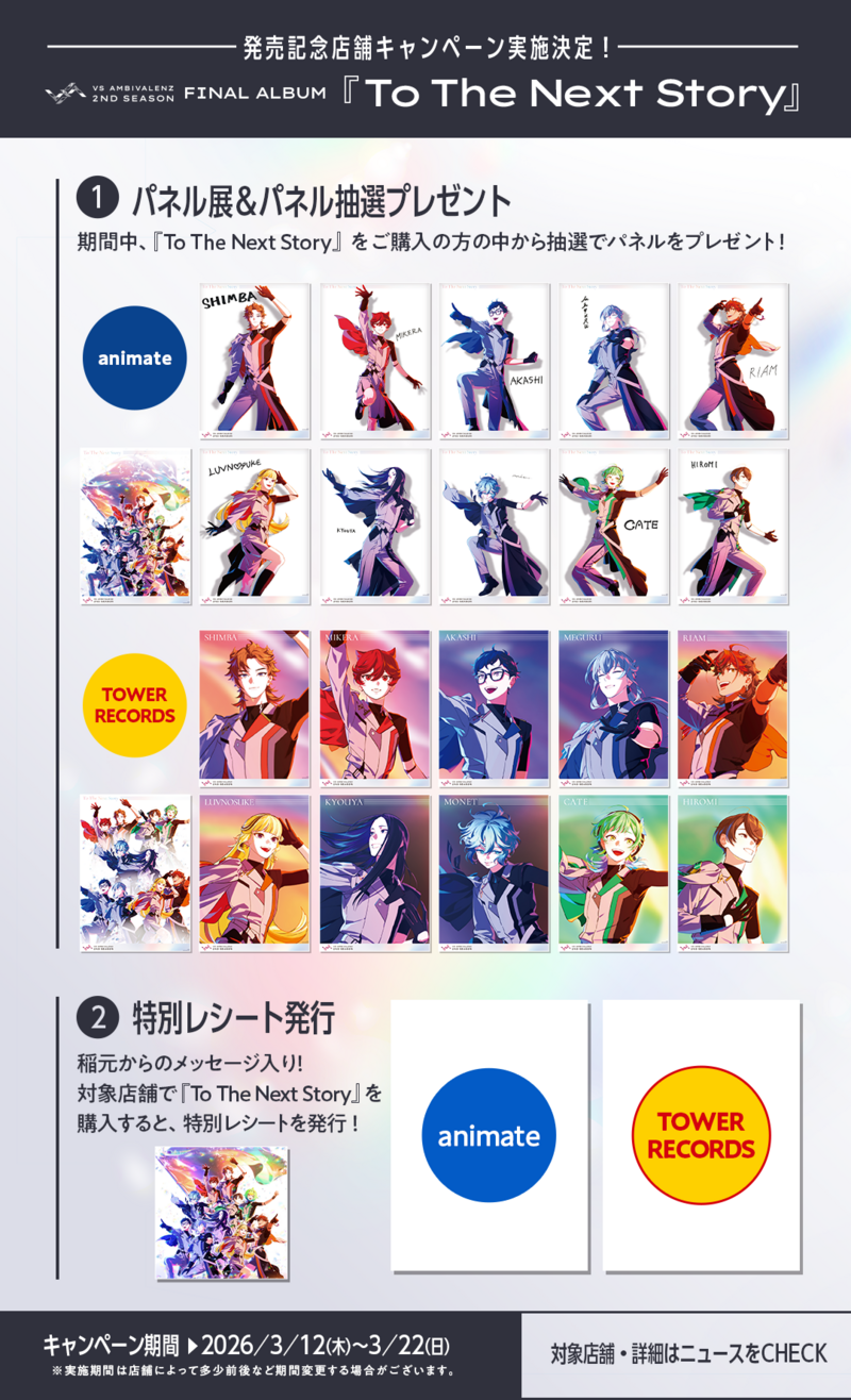 2026年3月13日(金) VS AMBIVALENZ 2nd Season FINAL ALBUM 『To The Next Story』の発売を記念して、CDショップでのパネル展、特別レシート発行が決定致しました!