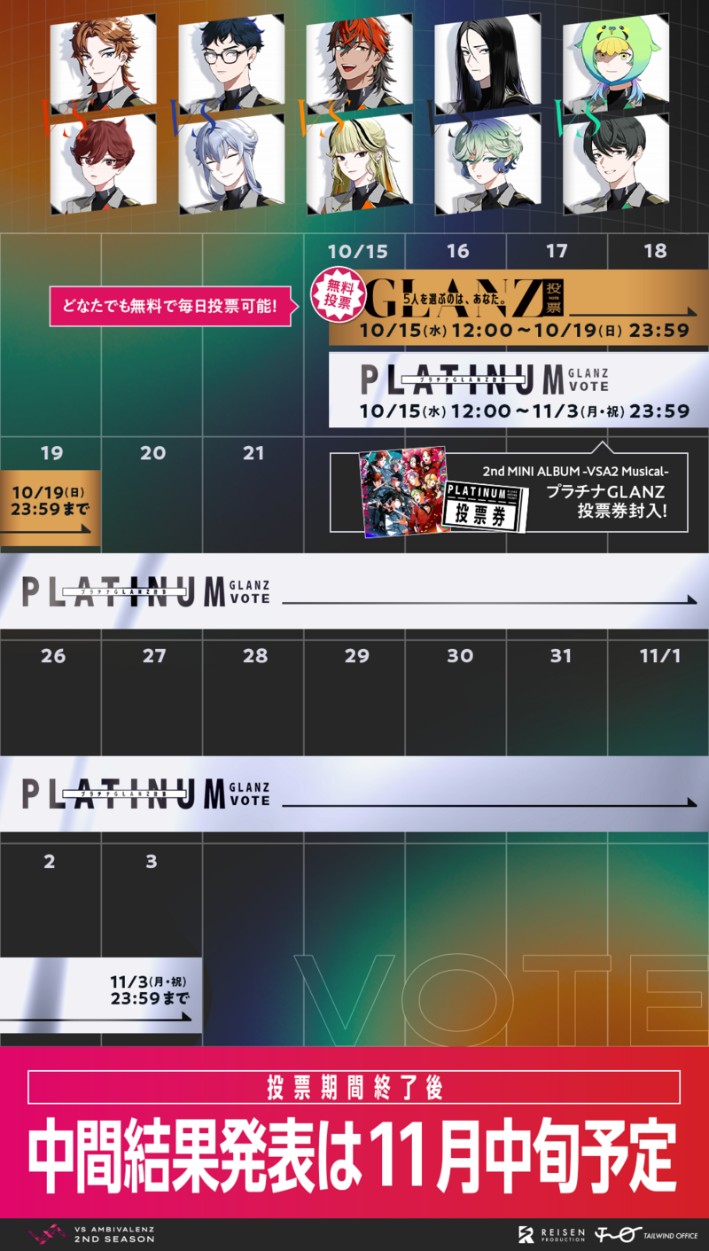 10/15(水) 12:00〜11/3(月・祝) 23:59 プラチナGLANZ投票(※2nd MINI ALBUM -VSA2 Musical-に投票券が封入!)