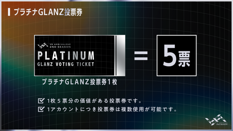 ・プラチナGLANZ投票券は、1枚につき5票の投票が行えます。